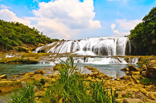 【陡坡塘瀑布概况】 陡坡塘瀑布位于贵州省黄果树瀑布上游1公里处,瀑顶宽105米,高21米,是黄果树瀑布群中瀑顶最宽的瀑布。陡坡塘瀑布顶上是一个面积达1.5万平方的巨大溶潭,瀑布则是形成在逶迤100多米长的钙化滩坝上。陡坡塘瀑布还有一个特殊的现象:每当洪水到来之前,瀑布都要发出“轰隆。轰隆”的吼声,因此又叫“吼瀑”。 【徐霞客与陡坡塘瀑布】 “遥闻水声轰轰,从陇隙北望,忽有水自东北山腋泻崖而下,捣入重渊,但见其上横白阔数丈,翻空涌雪,而不见其下截,盖为对崖所隔也。”这是徐霞客在《徐霞客游记》中对陡坡塘瀑布的描述。 【西游记与陡坡塘瀑布】 平时,白水河流量不大,水流清澈,陡坡塘瀑布显得十分清秀妩媚。瀑布水层沿着和缓的瀑面,均匀地撒开,在一鳞鳞的钙华滩面上轻盈地舞着,如一层薄薄的、半透明的面纱,又如一面面张开的素绢扇面,在阳光下泛着银光,故有人戏称为“新娘面纱”。但当洪季来临,白水河水由于携带了大量由洪水冲下来的上游泥沙而呈黄色的浊流时,陡坡塘瀑布便消失了往日平水时的秀色,而变得异常凶猛雄壮。黄浊的河水翻坝跌落,摧王捣冰,像一匹脱缰的野马,且瀑布左侧的钙华堆积而成的洞穴,在巨量洪水经过时会产生奇特的汽笛效应,发出低沉浑厚的吼叫声,故陡坡塘瀑布又称为“吼瀑”。 在陡坡塘瀑布的东侧山崖上,有一条小瀑布从芦苇丛中飞泻而下,还不等水流至地面,瀑布已散成层层水雾,从小瀑旁经过,只见晴空绵雨,横飘乱扬,并在阳光下折射成美丽的彩虹。修长清秀的小瀑与宽阔雄壮的陡坡塘主瀑形成一种强烈的对比,但似乎又和谐地组合在一起,这种瀑布组合亦是不常见的。