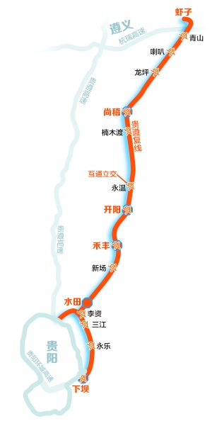 贵遵复线,主线和连接线均采用双向六车道高速公路标准,路基宽度33.5m,设计车速100km/h。起于遵义市绕城高速的青山,止于贵阳绕城高速的下坝枢纽处,将贵阳、遵义,以及开阳串接起来,形成新的高速公路通道,将对原有贵遵高速通行能力实现有效扩容。贵遵复线全长147公里,总投资约223.5亿元,起于遵义市绕城高速的青山,经遵义县、开阳县、乌当区等,止于贵阳绕城高速的下坝枢纽处,计划三年完工,将遵义、贵阳以及开阳等地串接起来,形成新的高速公路通道。线路采用双向六车道高速公路标准建设,设计速度每小时100公里,路基宽度33.5米。贵遵复线将在青山、喇叭、龙坪、尚稽、楠木渡、永温、开阳、禾丰、新场、李资、三江、永乐和下坝13处设置互通式立交,沿线群众将不用再绕行上贵遵线。 【相关附件】: ![]() |
