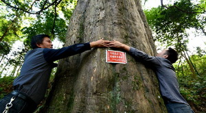 2014年10月26日,贵州省黔东南州岑巩县发现一株已有近两千年树龄的国家一级珍稀濒危保护植物红豆杉。 2014年10月26日,贵州省黔东南州岑巩县有关工作人员在客楼乡查看发现的一株已有近两千年树龄的国家一级珍稀濒危保护植物红豆杉。贵州省黔东南苗族侗族自治州岑巩县林业部门在该县客楼乡下寨村周家湾发现一株已有近两千年树龄的国家一级珍稀濒危保护植物红豆杉。该红豆杉被称为“千年豆杉王”。胸围有5.85米,树干直径1.86米,需要5个成年人牵手才能合抱,树高约30米,偌大的树冠枝繁叶茂,如巨幅绿色伞盖覆盖了约500平方米的地面。当地群众把它当着“风水神树”,每年都要到树下去烧香叩拜,祈求人畜平安、五谷丰登。经考证,这株“千年豆杉王”堪称是亚洲第一大红豆杉。