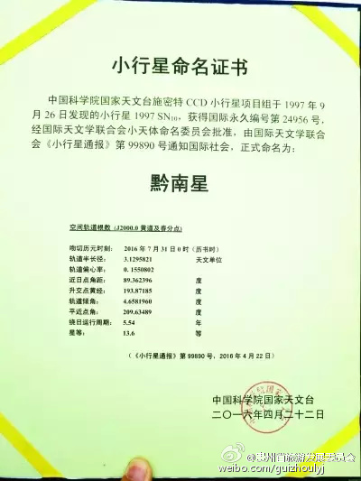 2016年8月8日,在贵州省黔南自治州60周年州庆系列活动之——“黔南星”揭幕仪式上,国家天文台副台长郑晓年宣读了“黔南星”命名公报:将1997年9月26日发现、具有命名权的国际永久编号第24956号小行星命名为“黔南星”。该决定已经获得国际天文学联合会小天体命名委员会批准,正式通报国际社会。 据介绍,为庆祝黔南布依族苗族自治州成立60周年,同时也是500米口径球面射电望远镜(Five-hundred-meter Aperture Spherical radio Telescope,简称FAST)建成之年,中国科学院国家天文台决定将1997年9月26日发现、具有命名权的国际永久编号第24956号小行星命名为“黔南星”。 当天,中国科学院国家天文台台长严峻向黔南州委副书记、州长向红琼颁授了“黔南星”命名证书和“黔南星”轨道运行图,并举行了“黔南星”纪念雕塑揭幕仪式。 相关链接: “黔南星”纪念雕塑设计理念是这样的: 雕塑中间旋转圆环,形似FAST望远镜,与“黔南星”星体遥相呼应,突出天文科技主题;穿插芦笙、绸带、铜鼓、毛尖等具有黔南特色的元素,充满黔南民族文化气息;一个圈体,两条绸带,体现黔南“一圈两翼”区域经济发展战略;为庆祝建州60周年,雕塑整体形态呈现“60”字样。 雕塑整体充分展现“登高望远、精益求精、勇于争先”的大射电精神,寓意依托世界最大单口径500米射电望远镜FAST,黔南的经济社会发展将会蒸蒸日上,闪耀星空。 【相关资料】 国际天文学联合会(IAU)国际小行星中心,于2016年4月22日发布99890公报,将第24956号小行星命名为“黔南星”。 “黔南星”命名公报 “黔南星”中国科学院国家天文台施密特CCD小行星项目组,于1997年9月26日发现,国际命名24956。黔南布依族苗族自治州,位于贵州省,拥有420万人口、43个民族,是FAST的所在地。 “黔南星”部分参数 轨道半长径:3.1291836天文单位 近日点角距:316.76917度 绕日运行周期:5.54年 星等:13.6等 【相关附件】: ![]() |