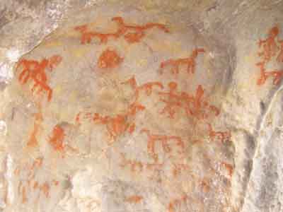 |        付家院岩画群遗址位于贵州省长顺县威远镇付家院村龙家院,距县城12千米。这个岩画群分两壁,一壁绘在当地人叫做红洞的岩壁上,另一壁绘在名叫白洞的岩壁上,两处岩壁皆在同一座山上,相距约100米。白洞岩壁较裸露,早年农民在此开了一眼窑洞烧制石灰,烟熏和灰尘污染严重,加之长期的风雨剥蚀,致使白洞的岩画大部分遭到破坏,甚为可惜。现在只剩下一些残图依稀可辨,但若经过专门的技术处理,将尘封的地方清理出来,该处的大部分图案也许还可复原。红洞岩洞盖面长约20米,宽约7米,画面处离地约2.3米。岩画所用的颜色系铁红色粉之类的矿物,呈红褐色。尚能清晰辨认图案有一百多个,主要是人、马、狗、飞禽、田畴等。此外还有一些特殊的符号。图案个体不大,小的只有几厘米,最大的一幅有45厘米长、29厘米宽,呈不规则三角形。从该图侧身望去、但见一块田畴几乎同该图完全对应,由此推知这当是一幅田畴图象。 岩画群中,有一幅狩猎图十分引人注目,画面上绘有一个骑马引弓搭箭作欲射状的猎手,左右前上方皆有一人骑马奔驰,这几人的马前马后是狗群,人、马、狗形成包围圈,圈内有野兽蹄痕的符号标记,整个画面呈出一派紧张的狞猎场面。值得注意的是岩画中多处有这样的符号:“+”,考古专家兼作家何新在《诸神的起源》一书中曾考证过这种符号(大量出在中国古代典籍、陶器、石刻、铜器等文物中),认为同远古华夏民族对太阳神的崇拜有关,并认定就是太阳神的符号。从总体上看,付家院岩画群描绘的是一幅狞猎和农耕生活并存的场景。据附近上了年纪的老人们讲,他们在孩儿时代就已经见过这些岩画,当地传说这些画是仙人所作,这个传说或许能够说明这些岩画产生年代的久远。 从美学角度来看,这些图案的造型都极简约概括,这种天真、稚拙、纯朴的表现手法正是艺术的一般风格。有趣的是这些岩画同云南沧源的原始岩画(据考证为新石器时代的产物)、广西宁明花山岩画、四川麻塘狮子岩画颇有近似之处。这种现象不能不使人联想到这些不同地区的岩画作者是否有某种族源的或文化的联系。如果将岩画这种文化现象作为一种文本看待,那么对这一文本的释读将成为研究贵州民族学的一种有力的实证资料。 相关附件:  | ||||