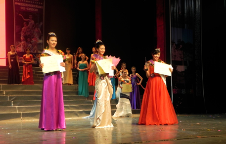 2012国际旅游小姐贵州赛区冠军龙慧(中)、2012国际旅游小姐贵州赛区亚军余白雪(左)、2012国际旅游小姐贵州赛区季军钟旭琳(右)