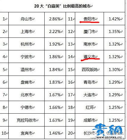 网传的。全国20大白富美比例最高城市,贵阳榜上有名!