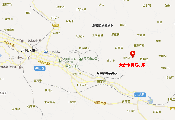机场位于六盘水市钟山区月照乡大坝村与水城县董地乡大窑村的交界处,是国家民航局“十一五”规划建设的,重点基础设施项目和贵州省“十一五”综合交通规划项目之一,六盘水市立体交通的重要一环、标志性工程。机场距市中心直线距离10.5公里,公路距离约15公里。工程按满足2020年旅客吞吐量25万人次,货邮吞吐量1250吨的目标进行设计。