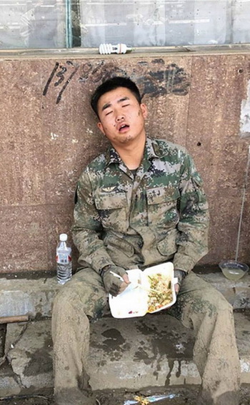 日前,一张织金“6.28”抗洪现场的图片在网上广泛流传,照片中,一名身着迷彩服的解放军战士,裤腿上裹满了泥巴,一双鞋子也已湿透,手里端着半盒饭靠着墙就睡着了。这张让人心疼的照片被市民拍下发在网上,引起了网友的热议,称是“最美的睡姿。”照片上的解放军战士李金龙。今年25岁的他,是解放军第十四集团军某旅的一名现役解放军战士。 李金龙的老家在织金县城。今年6月5日,他请假回家探亲,假期7月1日结束。这期间,织金县因连续的强降雨导致突发洪涝灾害,多个乡镇受灾严重,多名群众被困。 6月28日凌晨3点左右,正在县城北大街深圳三路卫生局宿舍一楼睡觉的李金龙,突然感觉床湿了。“起床一看,家里进水都快淹到膝盖了。”李金龙立即意识到发生了灾情,第一时间开始救人。 李金龙先去敲了多家邻居的门,让他们赶快逃生。之后又去帮助一家烙烤店抢救物资。来来回回好几趟,他都没有顾及家里的物资。 天亮时,织金县城已是一片汪洋。一些救援人员开始划着橡皮艇救人。 “作为军人,应该站在抗洪抢险的第一线。”李金龙说。随后,他加入了应急抢险分队的二组参与抗洪抢险中。李金龙先后在县武装部副部长韩永良的带领下,到绮陌乡、板桥中心、北大街、星秀田社区等抢险救援。 6月28日下午,李金龙正在北大街清淤,突然一名青年跑过来拉住他的手臂求援说:“我母亲被困在家里,求求你帮我救救她!”随即,他和退伍的战友拿着一个救生圈和一根绳子,跟着这名青年赶往现场。 退伍的战友赵博在边上拉着绳子,他套上救生圈去房屋中救人。 由于房门被泥沙堵住,推不开,房屋中的老人爬上窗台站立着,如果不抓紧时间救人,老人会有危险。李金龙反复在水中使劲多次,将泥沙刨开后总算把门推开。进屋后,李金龙将救生圈套在老人身上,自己推着救生圈,在外围战友的配合下,成功将老人救出。 太累了,端着饭就睡着了。 【参考文献】:贵州报纸 【相关附件】: ![]() |