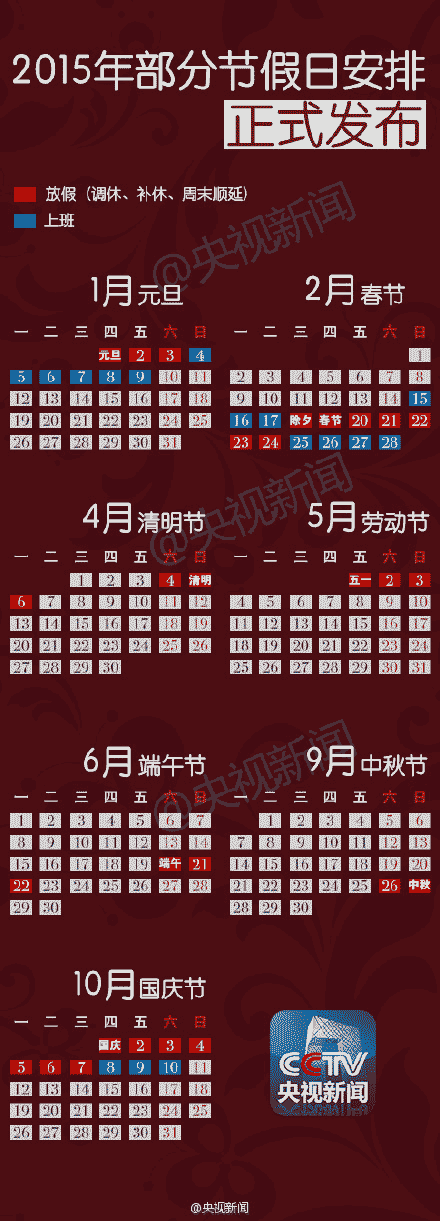 2015年放假安排时间表