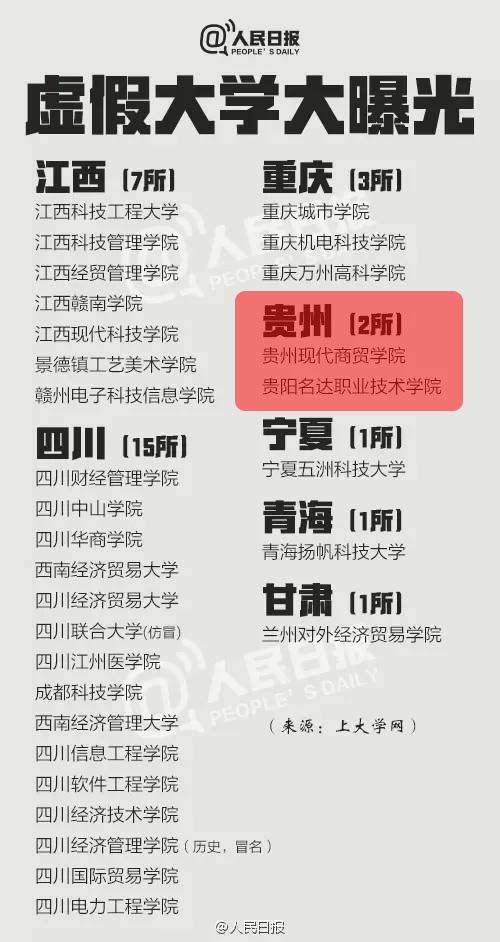 据《人民日报》信息,贵州有2所骗子大学。分别是贵州现代商贸学院,贵阳名达职业技术学院。