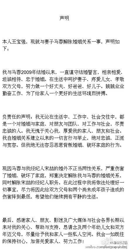 2016年8月14日凌晨,王宝强发表声明,与妻子马蓉解除婚姻关系。 8月14日凌晨,王宝强发布离婚声明,称“无法容忍恶意背叛婚姻、破坏家庭”。王宝强声明中指出:马蓉与我经纪人宋喆的婚外不正当两性关系,严重伤害了婚姻、破坏了家庭,郑重决定解除我与马蓉的婚姻关系,解除宋喆的经纪人职务。 今日凌晨,马蓉回应离婚及出轨事件:“欲盖弥彰,善恶自有真相。不是不报,时候未到。” 王宝强发声明,指责妻子马蓉出轨经纪人宋喆。宋喆被曝已婚,妻子系圈内经纪人杨慧,杨慧发微博回应:“因果有时报”。疑似马蓉朋友圈回应,怒斥王宝强疯狗会咬人,自己做错了事被知道了,做出伤天害理之事。