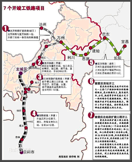 渝黔高铁,又名渝黔铁路扩能,即渝黔铁路新线,北起重庆市,经贵州省遵义市后向南到达贵州省省会贵阳市止。 渝黔铁路新线不但可使渝黔两地之间运能翻番,还将成为重庆出海大通道。 渝黔铁路旧线自重庆西站经綦江、遵义、息烽至贵阳北站,全长347公里。该线是西北、西南至华南地区快速铁路通道的重要组成部分,也是沟通重庆、贵阳两市的城际铁路。据了解,渝黔线开行客车每日12对、货车每日22对,线路通过能力利用率达95%,线路能力已饱和。 新建渝黔铁路新线,将为旧渝黔铁路姐妹路段,初步规划为国铁I级,全程345公里,时速为200公里。渝黔高速铁路将与兰渝线、贵(阳)广(州)线连接,成为西部另一个重要的快速出海通道。 渝黔铁路新线通车后,旧线路将逐步转为货运线路,渝黔高速铁路将更多地执行客运任务 。 渝黔铁路新线[2] 自身客货分流也已规划明确:磨心坡至铜罐驿线、鱼嘴至兴隆场货车外绕线以货为主,北碚经蔡家、重庆北站至鱼嘴,以及井口至小南海、重庆站、梨树湾环线以客为主。 新线项目确定的线路走向为:自重庆引出,经綦江、桐梓、遵义、息烽至贵阳北站,线路全长345公里。其中重庆市境内112公里。贵州境内233公里。 渝黔新线为新建复线,铁路主要功能是客运、快运和集装箱运输,主要技术指标要求转弯半径大于7000米,路基宽12米,坡度控制3‰以内,车站间距35-40公里、直线长度2.5公里、宽600米、铺设6条轨道。 【黔渝高铁的线路图】(来自网络 仅供参考) 【相关附件】: ![]() |