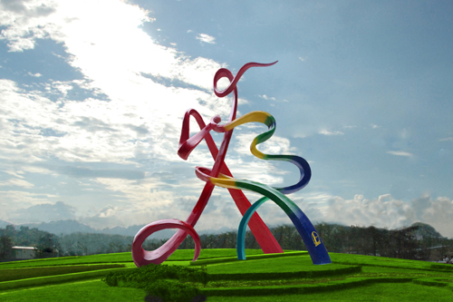 该雕塑总高30米,由不锈钢做成,重约100吨,将安放在机场路边上。雕塑设计是由“爽”字变形,中间突出一个在运动的“人”,整个雕塑给人以飘逸、清爽的感觉。
