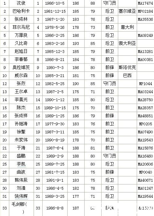守门员 沈俊:身披1号球衣 出生日期:1986年10月5日 身高:186cm 体重:88kg 籍贯:上海 张烈:身披12号球衣 出生日期:1982年2月25日 身高:190cm 体重:85kg 籍贯:沈阳 沈鹏:身披22号球衣 出生日期:1989年2月19日 身高:188cm 体重:80kg 籍贯:徐州 孙继海:身披17号球衣 场上位置:后卫 1977年9月30日出生于辽宁省大连市 身高:183cm 体重:75kg 纳诺(Nano):身披7号球衣 出生日期:1980年7月7日 身高:1米86 体重:79kg 久比奇: 身披6号球衣 出生日期:1983年2月16日 身高193 体重:85kg 国籍:澳大利亚 吴伟:身披2号球衣 出生日期:1983年3月10日 身高:191cm 体重:80kg 籍贯:天津 张成林:身披3号球衣 出生日期:1987年1月20日 身高:183cm 体重:76kg 籍贯:安徽 万厚良:身披5号球衣 出生日期:1986年2月25日 身高:186cm 体重:79kg 籍贯:北京 芦强:身披5号球衣 出生日期:1989年1月8日 身高:186cm 体重:87kg 籍贯:大连 刘天祺:身披19号球衣 出生日期:1989年1月17日 身高:182cm 体重:80kg 籍贯:黑龙江 董阳:身披28号球衣 出生日期:1983年1月14日 身高:187cm 体重:80kg 籍贯:北京 中场 李春郁:身披9号球衣 出生日期:1986年10月9日 身高:184cm 体重:78kg 籍贯:沈阳 前卫 于海:身披21号球衣 出生日期:1987年6月4日 身高:183cm 体重:70kg 籍贯:河南 杨一虎:队内最具潜力的小将 90后 攻破皇马大门 身披14号球衣 场上位置:前卫 出生日期:1991年9月16日 身高:175cm 体重:65kg 籍贯:广东深圳 罗达斯:身披20号球衣 出生日期:1984年1月1日 身高172cm 体重75kg 国籍:阿根廷 杨昊: 身披29号球衣 出生日期:1983年8月19日 身高:176cm 体重:66kg 籍贯:北京 王尔卓:身披13号球衣 出生日期:1987年2月5日 身高:175cm 体重:71kg 籍贯:西安 陈杰:身披15号球衣 出生日期:1989年10月1日 身高:175cm 体重:70kg 籍贯:深圳 杨磊:身披24号球衣 出生日期:1993年1月9日 身高:180cm 体重:71kg 籍贯:云南丽江 廖林琨:身披26号球衣 出生日期:1993年1月1日 身高:186cm 体重:81kg 籍贯:武汉 郭胜: 身披33号球衣 出生日期:1993年1月7日 身高:180cm 体重:75kg 籍贯:上海 前锋 曲波:“追风少年” 身披27号球衣 出生日期:1981年7月15日 身高:182厘米 体重:72kg 籍贯:天津 穆斯利莫维奇(Zlatan Muslimovic) 身披9号球衣 出生日期:1981年3月6日 身高:189cm 国籍:波黑 拉法·约尔达:阳光男孩 身披11号球衣 出生日期:1984年1月11日 身高:192 体重:85kg 国籍:西班牙 李凯:身披25号球衣 出生日期:1989年7月25日 身高:188cm 体重:80kg 籍贯:青岛